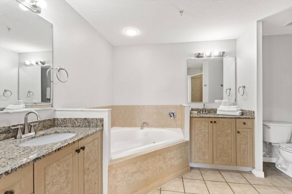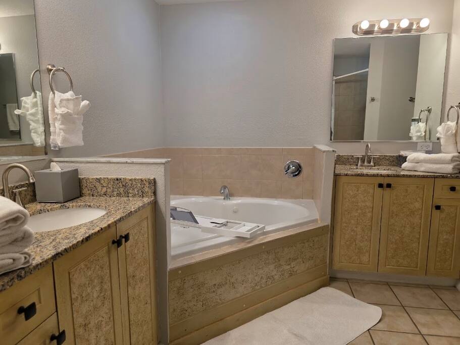 🏠 Your Property Bedrooms: 3 total Master Suite: King bed, ensuite bath with soaking tub, walk-in shower, dual sinks, and TV Bedroom 2: Queen bed with nearby full bath Bedroom 3: Two twin beds with its own bathroom Bathrooms: 3 full baths with fresh towels and essentials Kitchen: Fully equipped with granite counters, full-size appliances, cookware, and dishes Living Area: Open layout with sofa, armchairs, smart TV, and access to balcony with pool/lake views Extras: Washer/dryer, free WiFi, and central A/C