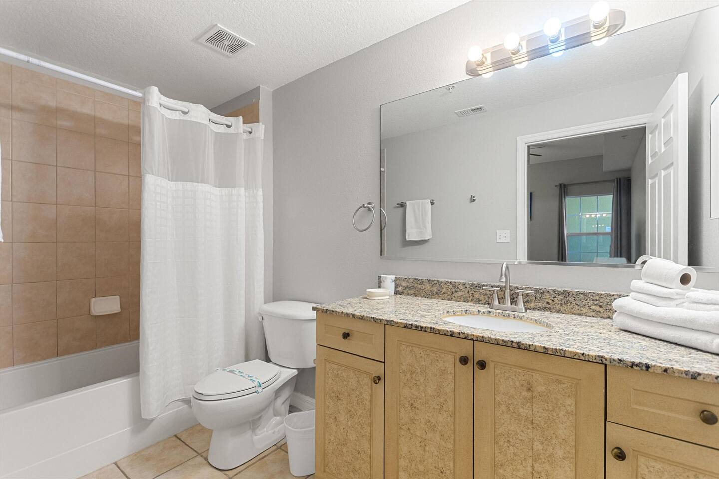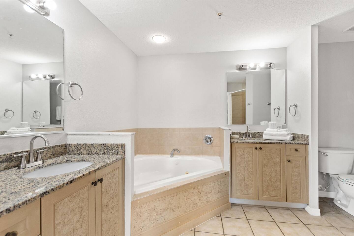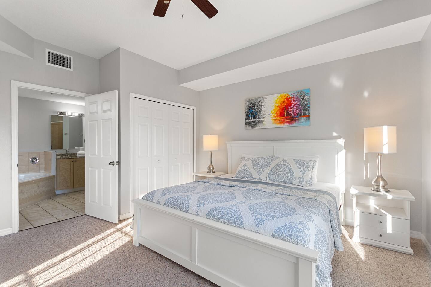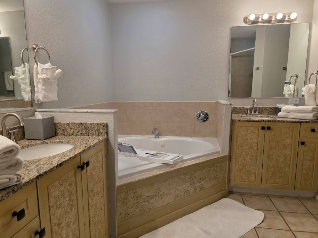 🏠 Your Property Bedrooms: 3 total Master Suite: King bed, ensuite bath with soaking tub, walk-in shower, dual sinks, and 55"TV Bedroom 2: Queen bed with nearby full bath Bedroom 3: Two twin beds with its own bathroom Bathrooms: 3 full baths with fresh towels and essentials Kitchen: Fully equipped with granite counters, full-size appliances, cookware, and dishes Living Area: Open layout with sofa, armchairs, smart 85" TV, and access to balcony with pool/lake views Extras: Washer/dryer, free WiFi, and central A/C
