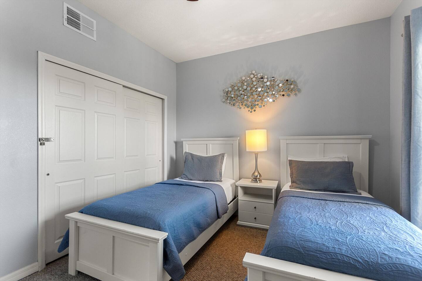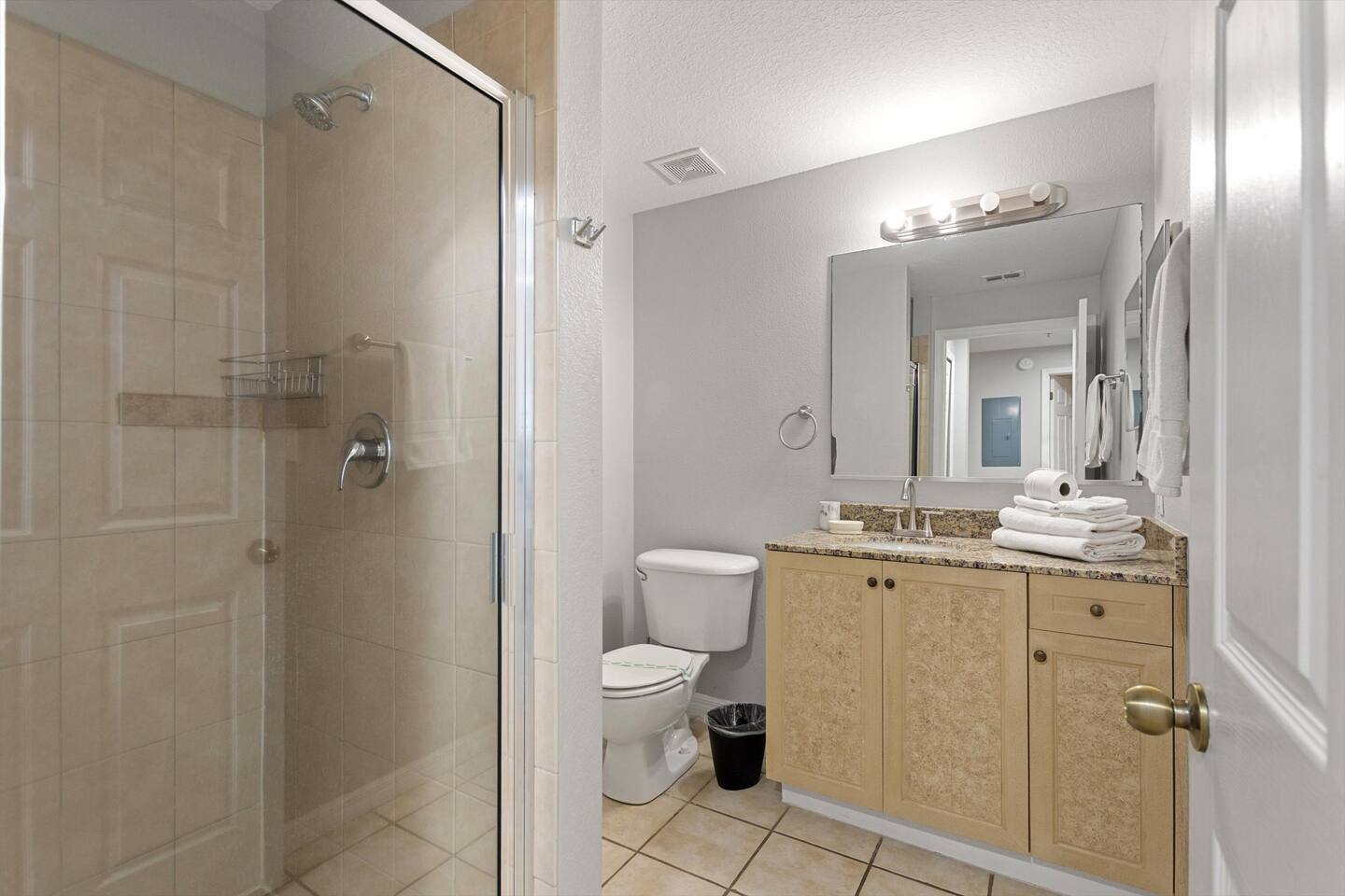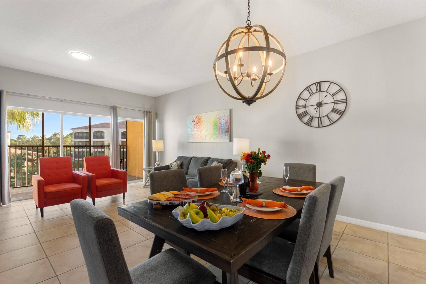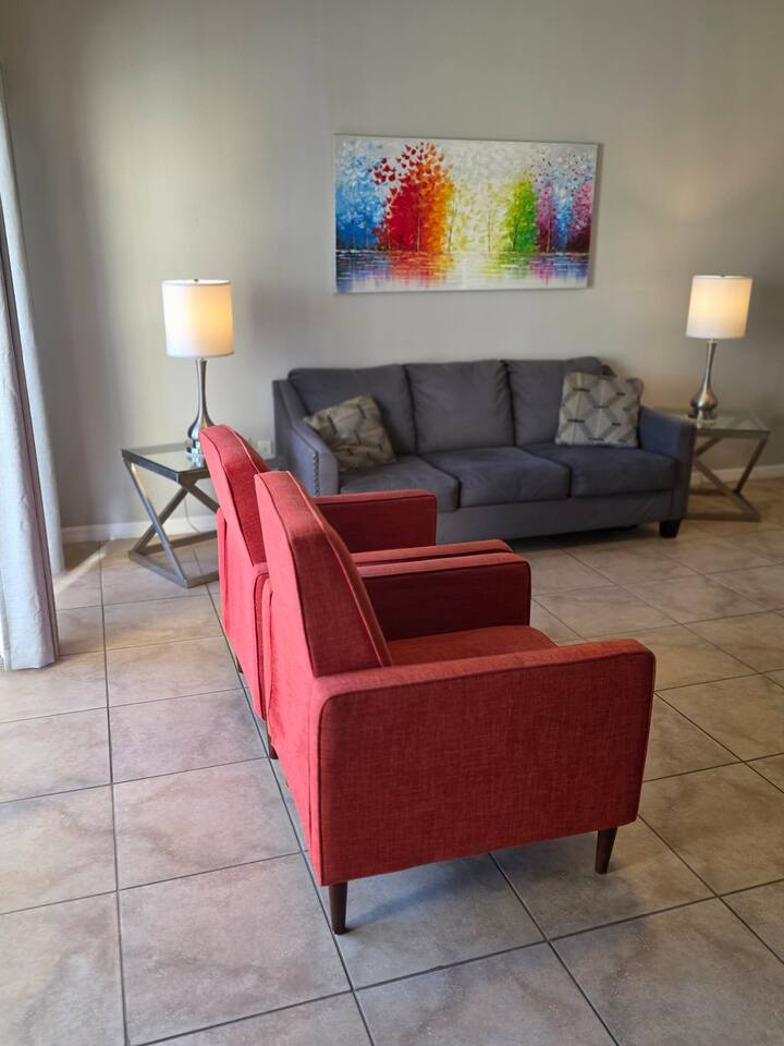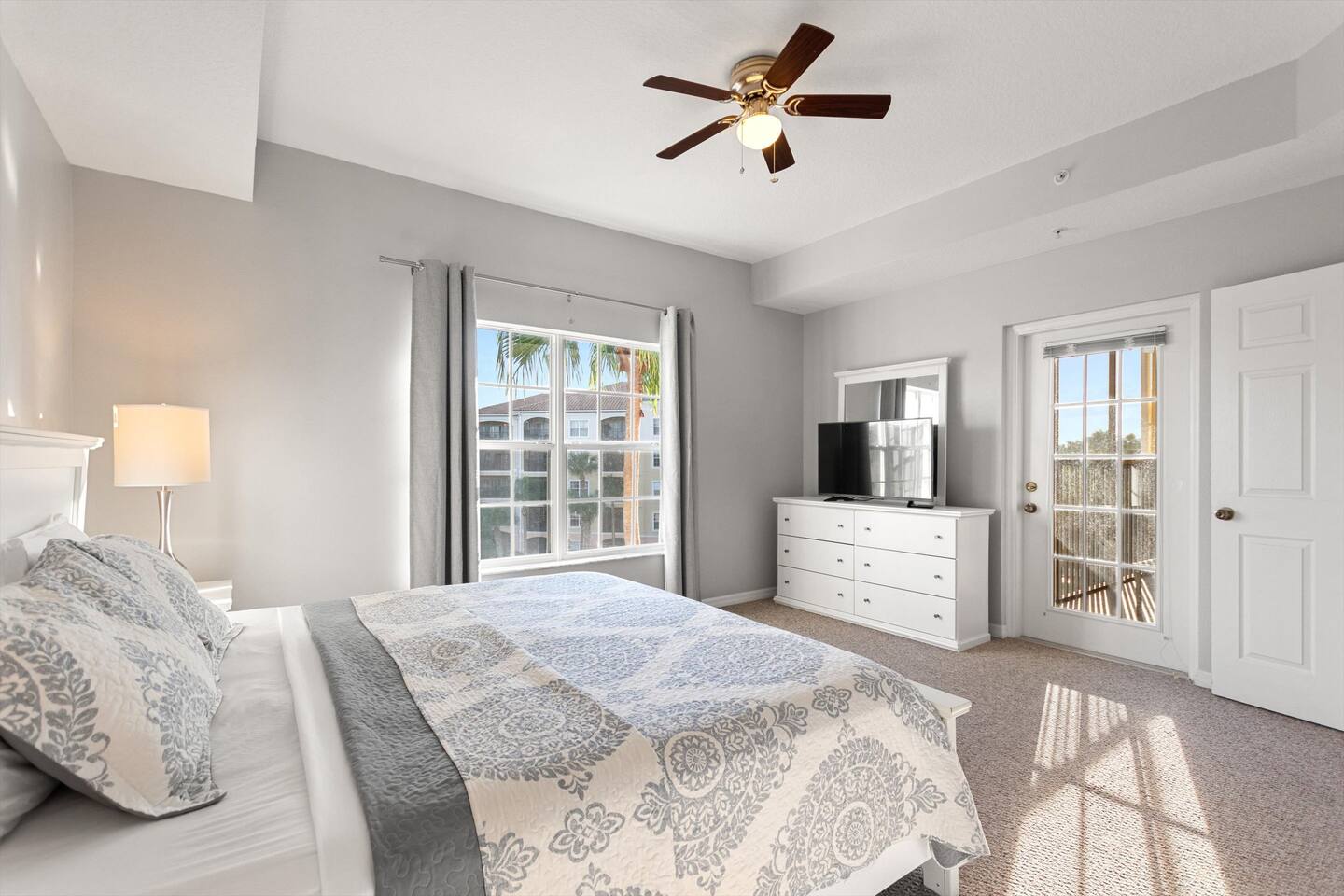🏠 Your Property Bedrooms: 3 total Master Suite: King bed, ensuite bath with soaking tub, walk-in shower, dual sinks, and 55"TV Bedroom 2: Queen bed with nearby full bath Bedroom 3: Two twin beds with its own bathroom Bathrooms: 3 full baths with fresh towels and essentials Kitchen: Fully equipped with granite counters, full-size appliances, cookware, and dishes Living Area: Open layout with sofa, armchairs, smart 85" TV, and access to balcony with pool/lake views Extras: Washer/dryer, free WiFi, and central A/C